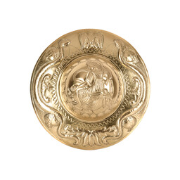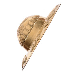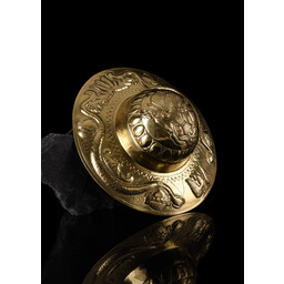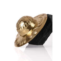 This round umbo is a replica of an original from the Guttmann collection and provides an ideal solidity of the shield. The umbo has a diameter of 24 cm. It is completely handmade.